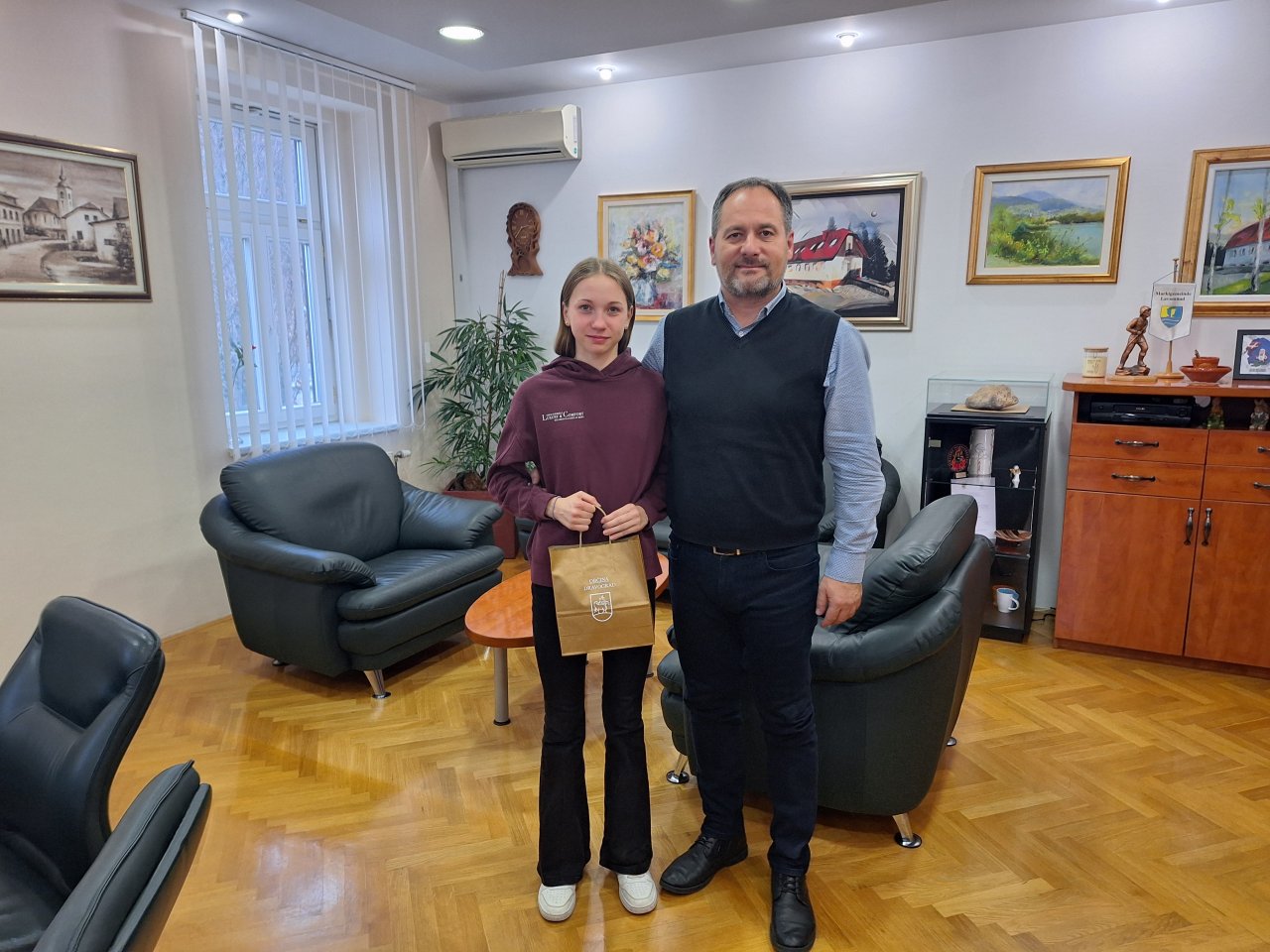 Ker se v preteklem letu ni mogla udeležiti prireditve Športnik leta, jo je danes v svoji pisarni sprejel župan Občine Dravograd Anton Preksavec in ji predal plaketo. Obenem ji je čestital in ji zaželel še veliko sreče pri njenih športnih uspehih.