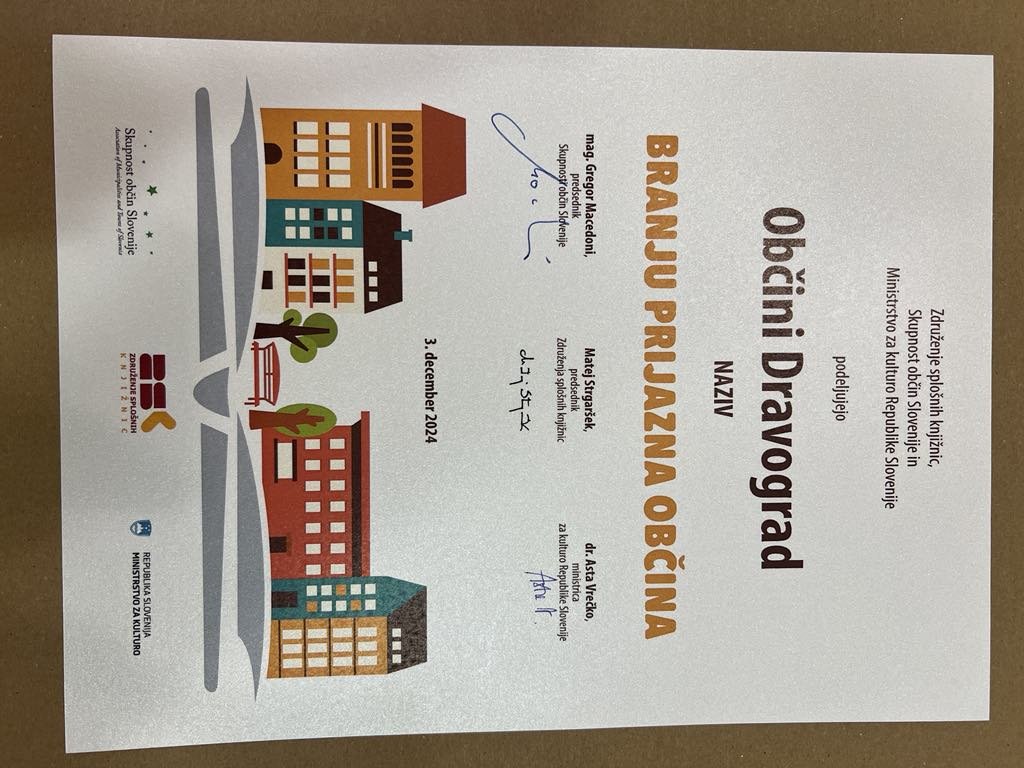 Včeraj, 3. decembra 2024, je na Ministrstvu za kulturo RS v Ljubljani potekala podelitev listin Branju prijazna občina, na kateri je Občina Dravograd prvič prejela ta naziv.