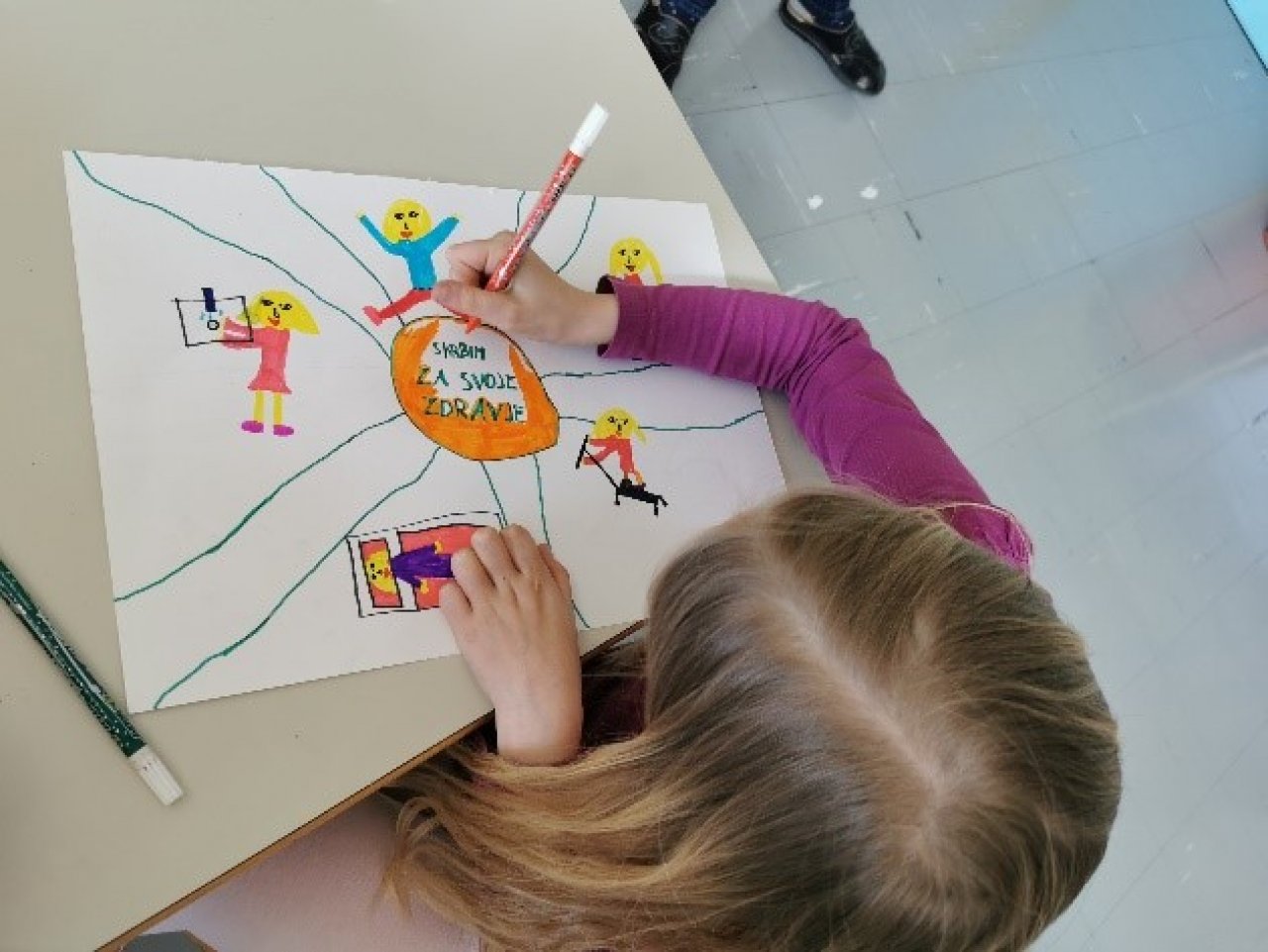 Zdravstveno tematiko so učitelji v razredu nadgradili s pogovorom z učenci in njihovim nadaljnjim ustvarjanjem. Učenci 1. triade so ustvarjali likovne izdelke na temo zdravja, zdrave in nezdrave prehrane, gibanja in boljšega počutja. Učenci 2. in 3. triade pa so v pisnih izdelkih razmišljali o tem, zakaj se radi ukvarjajo s športom, kakšno zdravo hrano pripravljajo in uživajo doma, zakaj energijske pijače in tobačni izdelki niso v redu ter kaj storijo, ko so v stresu, stiski ali so žalostni. Ustvarjene izdelke, plakate z odgovori učencev smo razstavili v avli šole, kjer si jih lahko tudi ogledate. 2., 3. in 4. uro so športni učitelji pripravili še dejavnosti razgibavanja. Zaradi lažje izvedbe smo jih opravili v veliki telovadnici. Šolska shema sadja in zelenjave se je v tem tednu prestavila iz srede na petek. Za učence so bila pripravljena jabolka v še bolj mamljivih košaricah kot po navadi. V 1. nadstropju so lahko učenci v kotičku našli veliko spodbudnih aktivnosti za krepitev svojega duševnega zdravja: lahko so zavrteli kolo z različnimi gibalnimi izzivi ter v škatlo pozitivnih misli, spodbud in pohval zapisali kaj lepega svojemu sošolcu, prijatelju, učitelju ali komurkoli na šoli. Vse izdelke lahko še vedno uporabljajo in občudujejo.