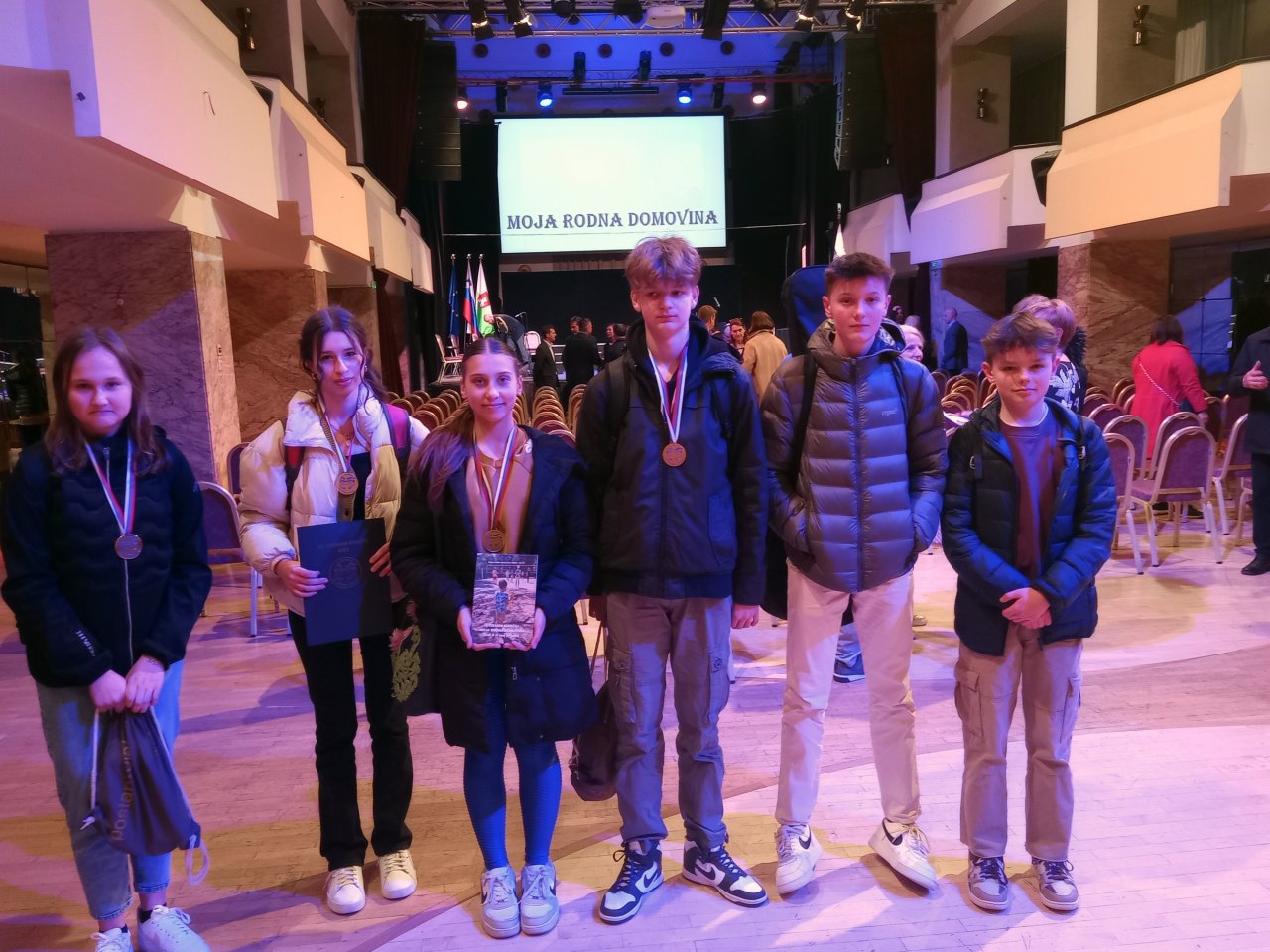 Ob sedmih zjutraj smo se s kombijem odpravili v Ljubljano, kjer je bila organizirana svečana podelitev nagrad natečaja Moja rodna domovina. Z nami sta potovali učiteljici Marijana Pšeničnik in Darja Lesnik. Na poti smo se ustavili še na Trojanah.