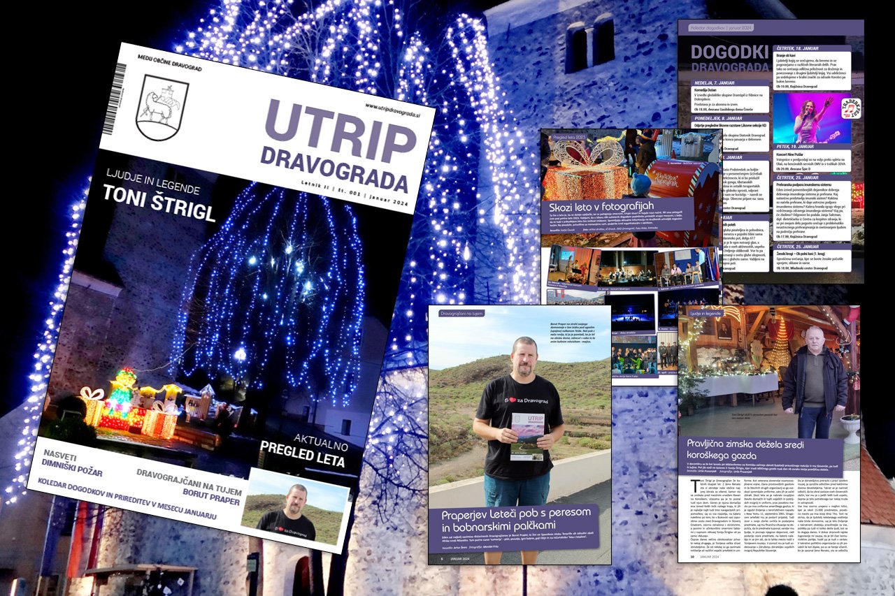 V januarski številki, prvi v drugem letniku Utripa, preberite Korošakove nasvete, kako preprečiti, da bi prišlo do požara v dimniku, pa mojstra okraševanja, Tonija Štrigla iz Selovca in zgodbo o oddaljenem Dravograjčanu, Praperjevem pobu, ki živi na španskem otoku Tenerife, delu Kanarskih otokov ob zahodni afriški obali. V Utripu je kot vedno še veliko novic in koledar dogodkov za januar.