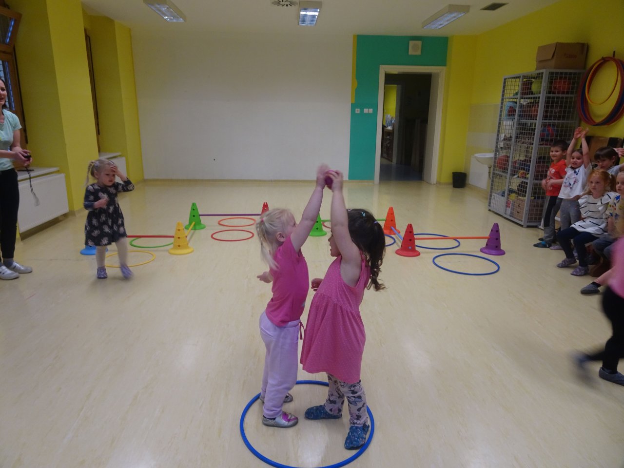 Zato je bil april v našem vrtcu prav poseben, saj smo vzgojiteljice za otroke organizirale nočitev v vrtcu. Naš namen je bil otrokom omogočiti, da preživijo noč brez staršev, izven doma, skupaj s svojimi prijatelji. Popoldne so otroci v vrtec prikorakali z nahrbtniki, potovalkami in kovčki, vsi polni navdušenja. Brez večjih zadržkov so se poslovili od staršev in se polni pričakovanj prepustili dogodivščinam. Ob prihodu smo najprej pripravili ležišča, nato pa razložili svoje stvari iz nahrbtnikov in kovčkov. Ker je bilo zunaj deževno vreme, smo morali prilagoditi naše aktivnosti. Namesto igre na prostem smo se preselili v telovadnico, kjer so otroci uživali v različnih športnih igrah in aktivnostih. Različne discipline so bile prilagojene starosti in sposobnostim otrok. Po uvodnem razgibavanju se je začelo pravo tekmovanje. Ko so otroci uspešno zaključili nalogo, je bil njihov odziv poln navdušenja – mnogi so skočili v zrak, zaploskali z rokami in se objeli s prijatelji. S svojim smehom in veseljem so napolnili prostor, kar je ustvarilo prijetno vzdušje. Po igri je sledila večerja v jedilnici šole, kjer smo skupaj uživali v okusnih hot dog sendvičih, ki smo si jih pripravili sami.